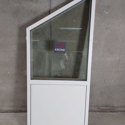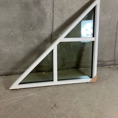 Skråvindues sæt 178x158,5cm i træ/alu med 3-lags energirude. Hvert vindue måler 89cm bred og 72cm i laveste højde (158,5 på højeste). Der er selvforborede monteringshuller. Dimension: B: 178cm H: 158,5cm D: 13cm Se evt. lignende artikler her: https://kingogenbrug.biz/vare/kastrup-fastkarm-topstyret-vindue-2385x1575x115-cm/