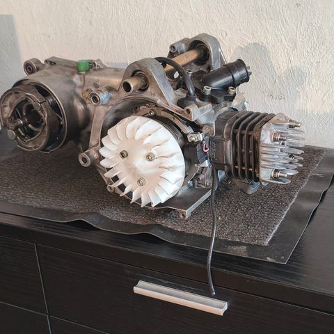 Alt i alt en super fin 50cc lang Minarelli motor i perfekt stand, dog med racing krumtap og lejer, så den roligt kan opgraderes til f.eks. 70cc racing, hvis ønsket. Motoren er i perfekt stand og passer bl.a. til Yamaha Jog R fra 2002 og frem. På denne motor kan du også benytte centerstøttefod. Motoren er testet for tæthed med leakdown-metoden og er fuldstændig tæt. Statoren er testet og virker som den skal. Oliepumpen er ny, men det anbefales altid selv at teste oliepumpen ved montering, inden den tages i brug. Motoren lækker ikke gearolie, og el-stator motoren virker som den skal.