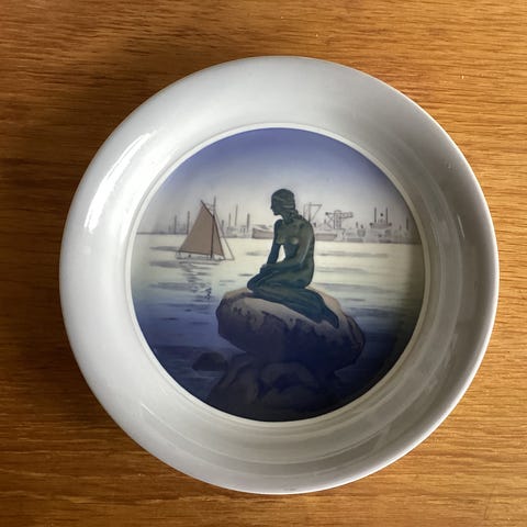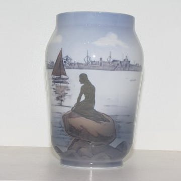 Royal Copenhagen Langelinie vase fremstillet i porcelæn med blå farvetema. Vasen har motiv af en kvinde ved vandet og måler cirka 20 cm i højden.