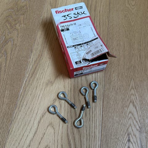 Original Fischer kasse med slaganker (plugs med tilhørende skruer). Perfekt til montering i beton, mursten og lignende underlag. Der er ca. 40 stk. tilbage i æsken.