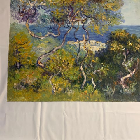Olie maleri, der forestiller et træ med blomstrende grene i et landskab. Udført på lærred uden ramme.