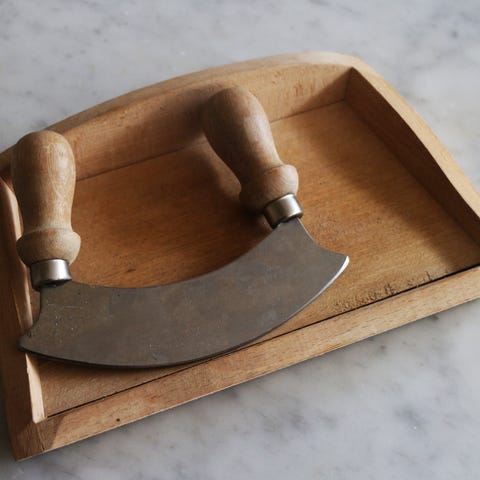 vuggekniv, hakkekniv, urteshakker, krydderurter, køkkenkniv, rustfrit stål, vintage køkken, retro køkken, dobbelt håndtag, urteskærer, køkkenudstyr, madlavning, dekorativ køkkenkniv, chokoladehakker, grøntsager, køkkenredskab