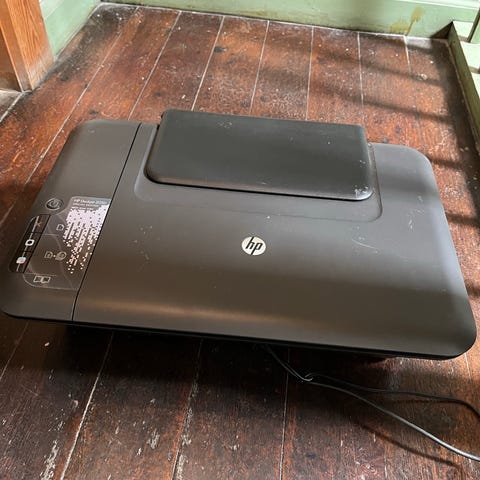 HP DeskJet 2050 All-in-One Printer med funktioner til print, scanning og kopiering. Sort farve og kompakt design. Inkluderer strømkabel og brugervejledning. Velegnet til hjemme- eller kontorbrug.