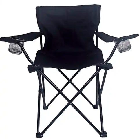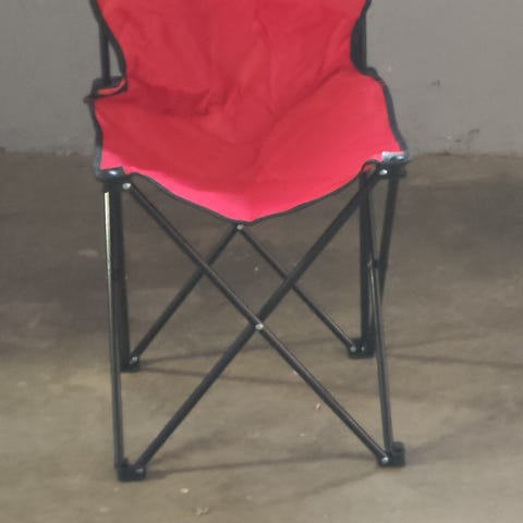 Sammenklappelig tripod stol med grøn stoffsæde og sort metalstel. Stolen er designet til nem transport og opbevaring, velegnet til udendørs brug som camping, fiskeri eller andre aktiviteter, hvor bærbar siddeplads er nødvendig.