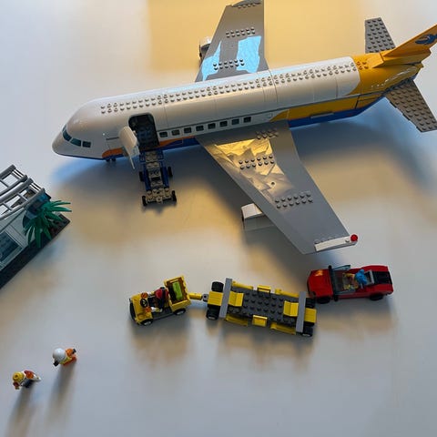 LEGO City 60021 Passagerfly Byggesæt med tilhørende figurer og tilbehør. Sættet indeholder et passagerfly i hvid og grøn farve, samt flere små dele til at bygge forskellige scener. Egnet til børn i alderen 5-12 år.