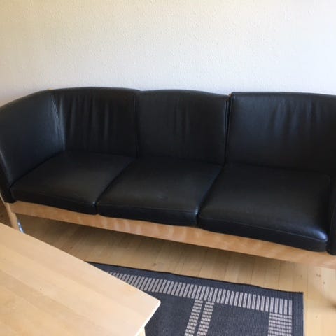 Lakeret bøgetræ med mørkegrå stofhynder (kraftigt stof). Sofaen fremstår meget velholdt idet den ikke er brugt ret meget. Ingen huller eller pletter. Løse hynder i både ryg og sæde.