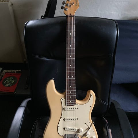 This is a “one owner” guitar and was purchased in early 1965 in a music store in Copenhagen. The owner was in a local Rock’n Roll band that only existed a few years and after the breakup, he kind of lost interest in playing the guitar and the Dakota Red Stratocaster was toked away… until now…