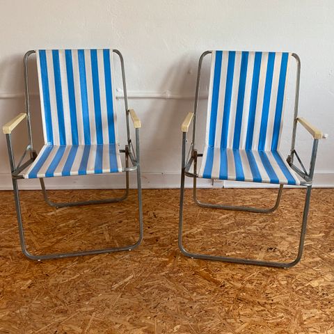 Sæt bestående af to strandstole i stof i blå og hvide striber.