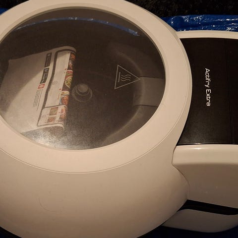 Tefal ActiFry Airfryer i sort farve. Modellen har en kapacitet på 16 L og en effekt på 1300 W. Den har en drejeknap til temperatur- og tidsindstilling. Airfryeren er designet til at tilberede mad med varm luft, hvilket giver mulighed for at lave friturestegt mad med mindre olie.