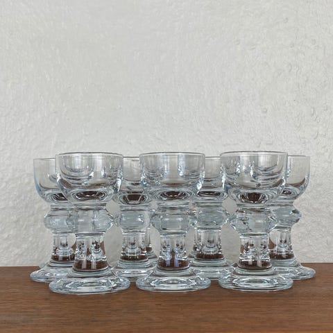 Sælges samlet. Design Per Lütken for Holmegaard. Glasene er fremstillet i klart glas og har en klassisk form med fod. H 8 cm,Ø 4,8 cm.