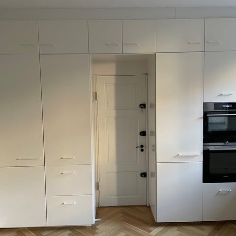 Køkkenskabe fra Ikea - Maximera med Veddinge-låger. Skabene ses øverst på billedet.