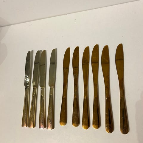 Bestiksæt bestående af 3 gafler og 4 knive med røde plastik håndtag. Købt i Paris. Knivbladene er lavet af rustfrit stål. Sættet er velegnet til almindelig brug i hjemmet. Samlet pris.