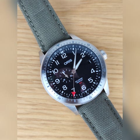 44 mm uden skruekrone, safirglas for og bag, 100 m vandtæt, original grøn lærred rem med originalt ORIS spænde. Uret er fra 2022 og jeg er eneste ejer på det.