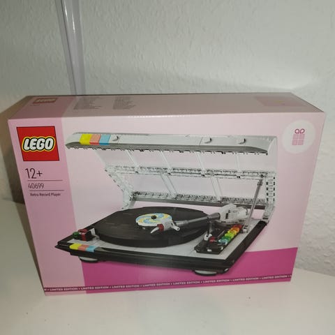 LEGO Icons Pladespiller Byggeklods sæt i hvid og sort med detaljer som pladespillerarm og plade. Sættet er designet til samling og udstilling og indeholder farverige klodser til dekoration.