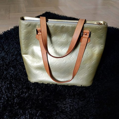 Louis Vuitton taske i lys grå lak med læder håndtag sælges. Modellen hedder “Straight” Den er i meget fin stand kun brugt til selskabelige lejligheder.