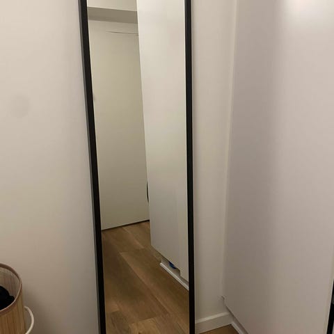 Spejl med hylde i sort metal. Spejlet har en firkantet form med en ramme og en integreret hylde under spejlet. Hylden kan bruges til opbevaring af småting. Spejlet er velegnet til vægmontering og kan anvendes i forskellige rum som entré, badeværelse eller soveværelse.