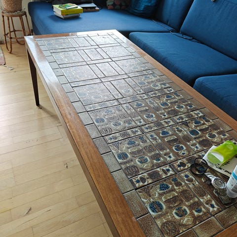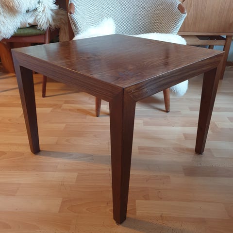 Poul Cadovius sofabord i klassisk dansk design. Bordet har et elegant stel i børstet stål og en smuk træplade med naturlig patina og lette brugsspor.