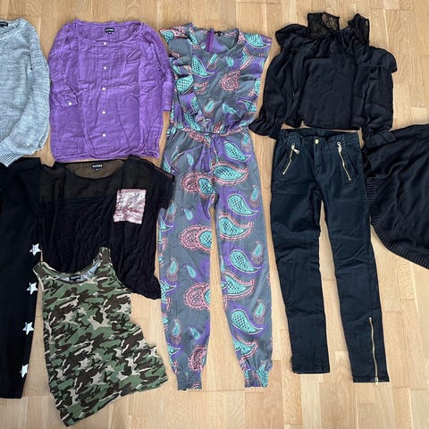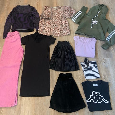 Inkluderer 3 kjoler, 1 jakke, 2 hættetrøjer, 2 fleece jakker/trøjer, 2 t-shirts, bukser piratbukser, sommertop og 2 toppe.