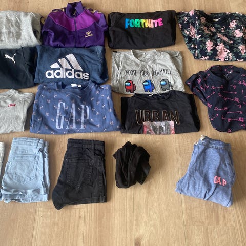 Indeholder 8 T-shirts / polo shirts med forskellige prints, Adidas shorts, undertøj, 2 kjoler, 2 hættetrøjer, 1 hvide jeans, 2 leggings, 1 joggingbukser, 1 smækbukser.