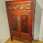 Antikt træskab købt i Copenhagen Green Square - originalt fra Kina fra Ming og Qing tiden. Med to flotte låger øverst og nederst og to dybe skuffer. Skabet har en varm, mørk træfinish og er udstyret med messingbeslag. Velegnet til opbevaring i stue, gang og på værelser.