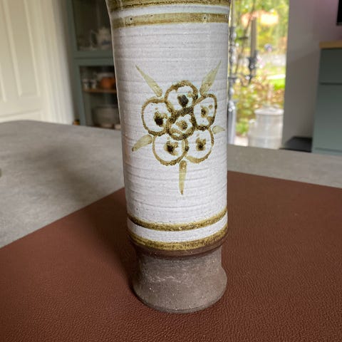 Fadet har en dybde med en indviklet blomsterprægning i midten. Den er lavet af keramik og har en tofarvet overflade med en lys yderside og en mørkere indvendig del.,Afhentes i:,Røde Kors Horsens (615),Bemærk at mail, chat og beskeder ikke besvares, og varen skal købes på knappen "Gå til varen"