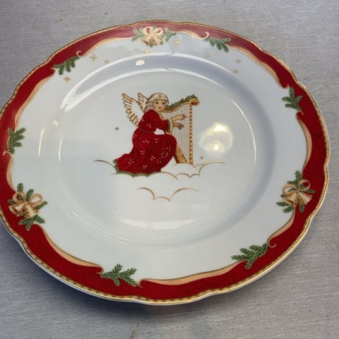Tallerkenen har en hvid bund med en dekorativ kant i rød og guld. Den viser et motiv af en engel i rød.,Afhentes i:,Røde Kors Horsens (615),Bemærk at mail, chat og beskeder ikke besvares, og varen skal købes på knappen "Gå til varen"