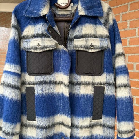 Munthe Andre Jakker til kvinder i størrelse 40. Jakken har et multifarvet ternet mønster med nuancer af sort, rosa og beige. Materialet fremstår som uld eller uldblanding, hvilket giver jakken en varm og behagelig følelse. Jakken har knaplukning foran og en krave, samt lange ærmer. Velegnet til brug som yderbeklædning i køligere vejr.