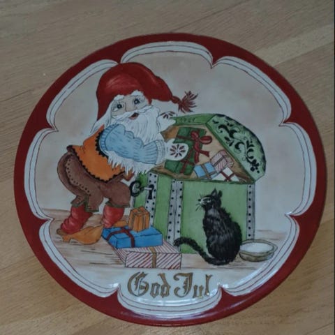 En dekorativ juletallerken med en diameter på 18,5 cm. Fadet har en unik ottekantet form og er dekoreret med nisser, der holder hinanden i hænderne i en cirkel rundt om kanten. På bagsiden står der 'MF JUL 83', sombetyder den er håndmalet for 42 år siden.