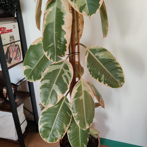 Ficus elastica, også kendt som gummitræ, er en stueplante med store, mørkegrønne blade. Planten egner sig til indendørs brug. Den kræver moderat lys og regelmæssig vanding for optimal vækst.