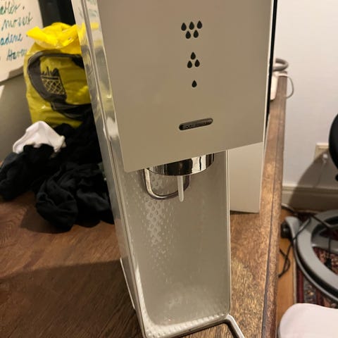 SodaStream Spirit sodavandsmaskine i sort farve. Kompakt design til fremstilling af kulsyreholdigt vand derhjemme. Inkluderer to genanvendelige flasker og en CO2-cylinder. Velegnet til husholdningsbrug.