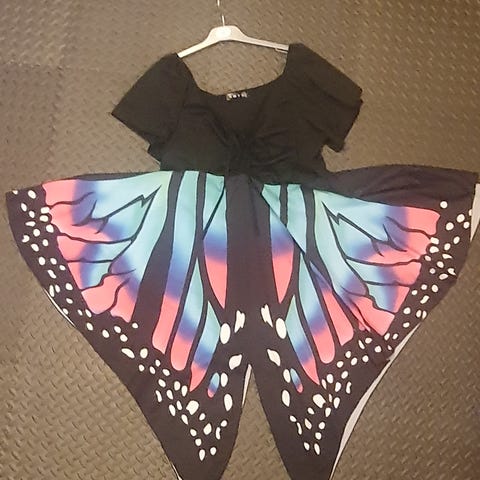 Damers elegante butterfly sommer kjole i violet blå str XL med sommer fugle uden ærme med stropper længde fra arm hul 77 cm bryst kant 90 cm rundt vide i skørt 90 cm se billed med tal,