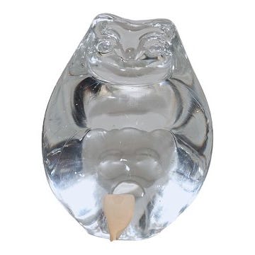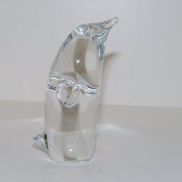 Dekorativ sparegris i koboltblåt glas, fremstillet af Holmegaard Glasværk omkring 1950 og designet af den banebrydende danske glaskunstner Jacob E. Bang. Grisen måler 12 cm i længden og ca. 8 cm i højden, og er udført i presset glas med karakteristisk tekstur: en let boblet overflade, der giver et levende spil i lyset og fremhæver den dybe blå farve. Formen er stiliseret og funktionel, med tydelige ben, snude og spareåbning – en kombination af humor og modernistisk enkelhed.