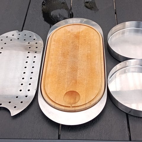 Andet, Fiskefad, Stelton, Fiskefad/serveringsfad. Cylinda line. Designet af Arne Jacobsen. Formgivet 1967. Produceret af Stelton. Rustfrit stål m træskærebræt. Fad & rist. Kun brugt et par gange, ellers bare stået i skabet. Skærebræt L: 38 cm | D: 26 cm. Fremstår særdeles velholdt. Sender gerne