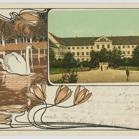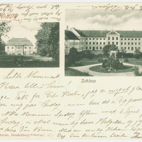 Postkort stemplet Augustenburg 15.8.1916 med Slotshotellet tv. og Hofrådens Hus th. på Storegade i Augustenborg, som den så ud kort før genforeningen 1920. Mellem træerne skimtes Kavalerbygningen, hvor H. C. Andersen, som hertugparrets gæst, overnattede i sept. 1844.