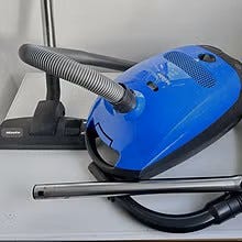 Miele Electronic S426i støvsuger med rød farve. Inkluderer slange, teleskoprør og gulvmundstykke. Designet til effektiv rengøring af forskellige overflader. Kompakt og praktisk model til husholdningsbrug.
