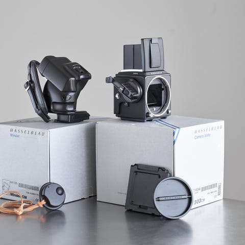 Der medfølger: Hasselblad 503CW med skaktsøger og manuel winder, batteridrevet winder, trådløs udløser og begge dæksler til back og kamera.