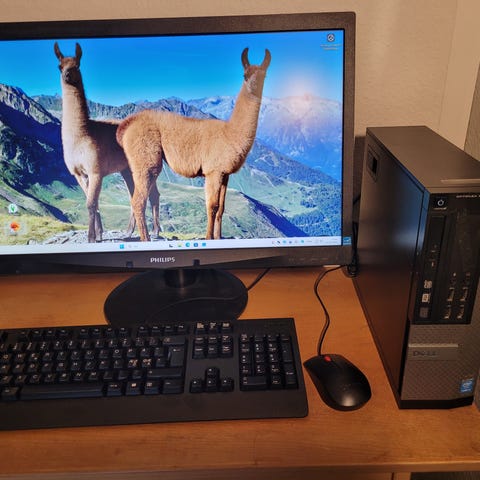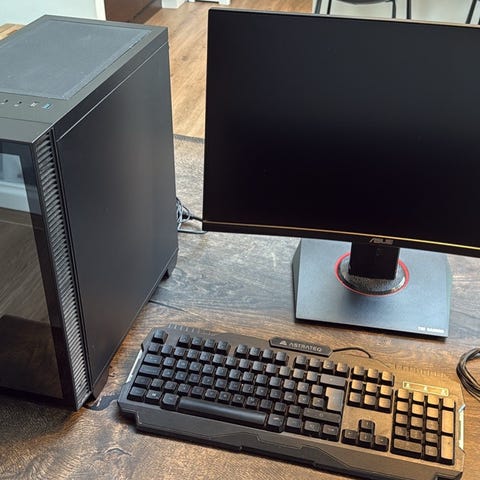 Pc med skærm, mus og tastatur, god til lette spil som Roblox.