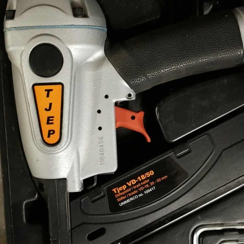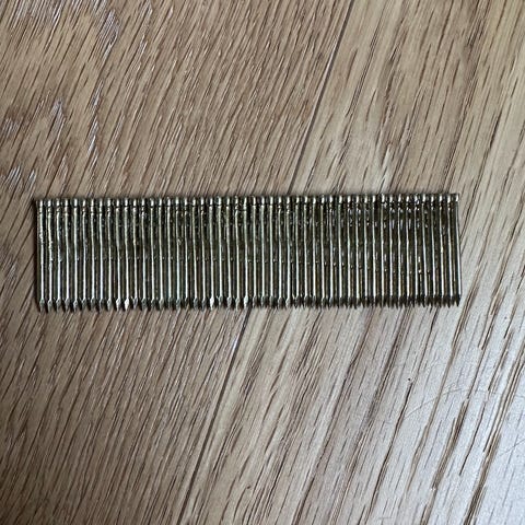 En kasse med galvaniserede Tjep TF-18 stifter (50 mm) til brug i stiftepistoler som Tjep, Paslode, DeWalt, Makita, Milwaukee m.fl. Oprindeligt 5.000 stk, der er 4.300 stk tilbage.