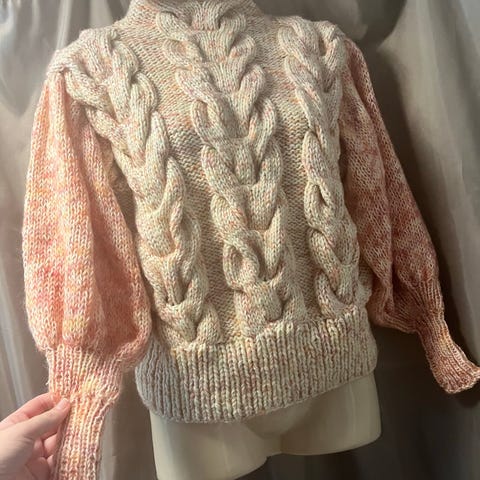 Super fin hjemmestrikket sweater med striber i gammel Rosa og bordeaux, bunden er lavet i råhvid boucle men den syner lidt grå i farven. Kommer desværre ikke til at gå med den da modellen ikke lige er mig alligevel 😊