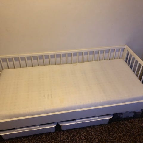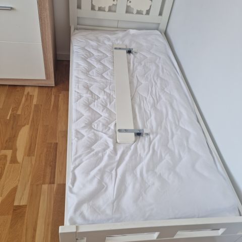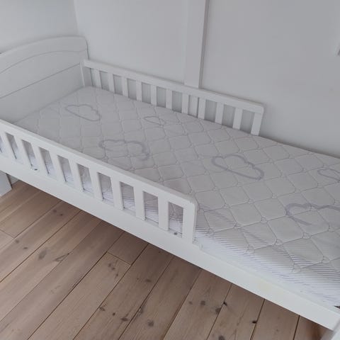 Juniorseng 160x75 cm med madras med vaskbart betræk sælges. I fin stand. Har en enkelt reparation af en mede under.