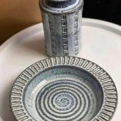 keramikskål med dekorative motiver i brunlige og beige toner. Skålen har en rund form med et bredt kantområde og detaljerede figurer rundt om ydersiden. Indvendigt er skålen glaseret med en spiralformet tekstur. Skålen er velegnet til dekorative formål eller som opbevaringsskål. Materialet er keramik, og skålen har en solid bund med mærker og signaturer under bunden.