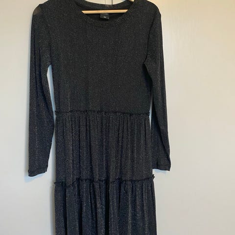 Blå glimmerkjole med bindebånd og ballonærmer . I flot, blå glimmer jersey - så masser af stræk. Str. 46 og brugt et par gange.