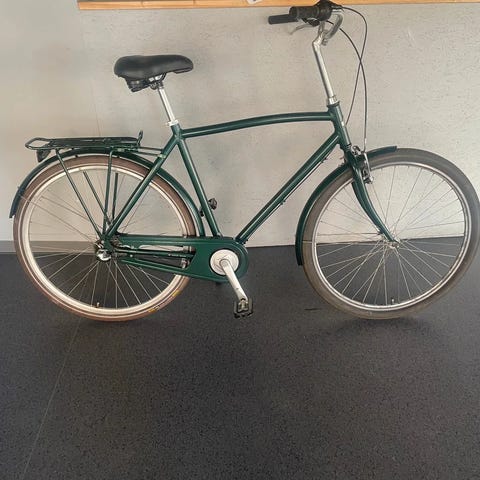Den er nyserviceret, smurt og justeret og har fået ny sadel, nye håndtag, ny gearskifter, nye bremseklodser, ny kæde og ny ringeklokke.