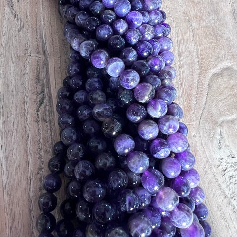 Fine, ret klare lyse 6mm ametyst perler på streng, 65 perler per streng. Pris per streng 35kr, 10 strenge 300kr.