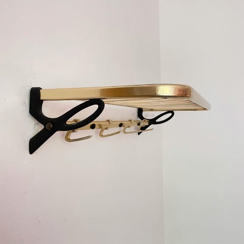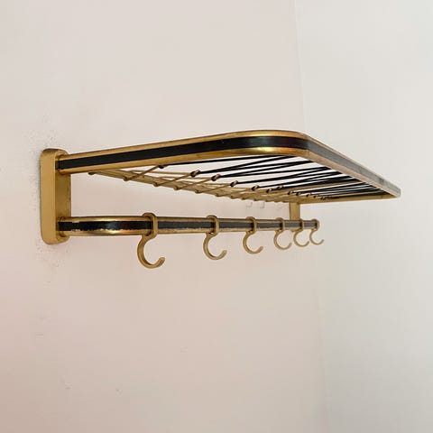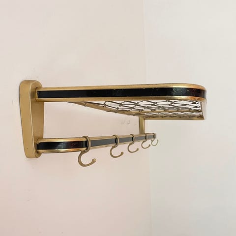 Direkte fra 1950’erne - tror jeg og fra Tyskland. Retro hattehylde og knagerække - super flot med plastik snore i rød og sort. Tidens tand - 75år kan ses visse steder, men flot alligevel. Med 5 messing kroge.