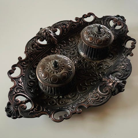 Pennebakke, Bronze, 80 år gl., Fin art deco pennebakke i bronze. Ca. 1942-44. Pennebakke med kogle/blomsterknop på toppen af blækhuset og med fin jaguar eller andet kattedyr. Kan ses/afhentes i Aarhus C eller sendes for købers regning.