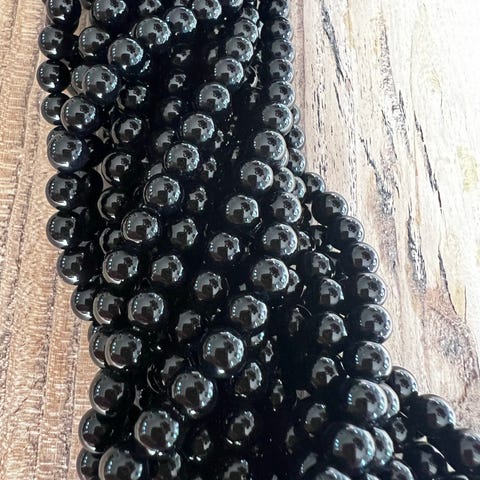 Fine, blanke sorte 8mm black stone perler på streng, 53 perler per streng. Pris per streng 35kr, 10 strenge for 300kr.
