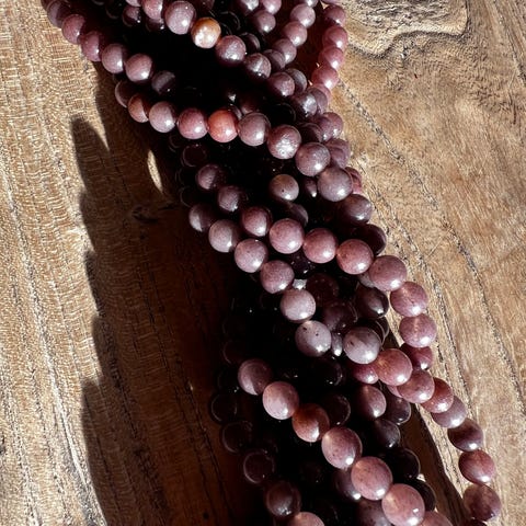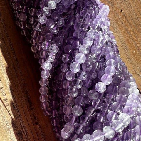 Fine lilla 8mm ametyst perler på streng, 52 perler per streng. Pris per streng 35kr, 10 strenge 300kr.