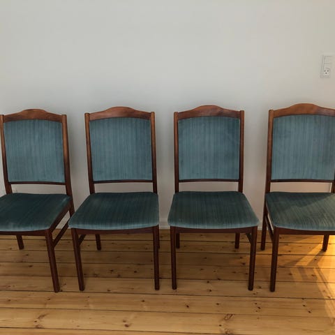 Jeg sælger fire nyombetrukkede spisebordsstole i teaktræ. De er ombetrukket med møbeluld med flot vævning i mørk petroleum 😊 De er velholdte med mindre brugsspor.