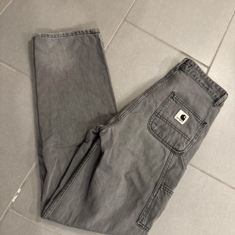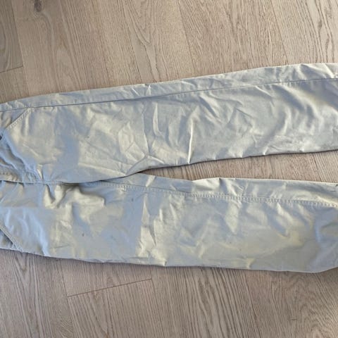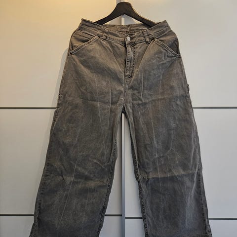 Det er str W26 og vil skyde på det er længde 32 (dette står ikke på mærket) de er brugte men passet godt på - en enkelt fejl ved skridtet (se billede), men der er ikke hul, blot noget stof som er løftet. Kommer fra røgfrit hjem.